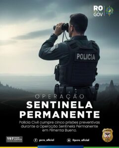 A Polícia Civil do Estado de Rondônia (PCRO), por meio da 1ª Delegacia de Polícia Civil de Pimenta Bueno, deflagrou, entre os dias 24 e 28 de novembro, a Operação SENTINELA PERMANENTE, destinada ao cumprimento de mandados judiciais de prisão preventiva expedidos em desfavor de cinco suspeitos envolvidos em crimes de roubo majorado e extorsão majorada no município.