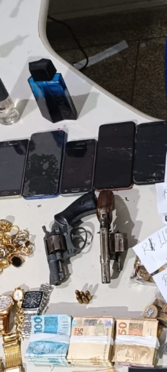 Na residência, os policiais encontraram diversos itens provenientes do roubo, incluindo uma motoneta, dinheiro em espécie, relógios, perfumes, bebidas alcoólicas e outros objetos pessoais. Também foram apreendidas armas de fogo, munições, balanças de precisão, porções de maconha e vários aparelhos celulares, alguns envoltos em papel alumínio — possivelmente para dificultar rastreamento.
