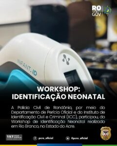 A Polícia Civil do Estado de Rondônia (PCRO), por meio do Departamento de Perícia Oficial e do Instituto de Identificação Civil e Criminal (IICC), participou, no dia 4 de dezembro de 2025, do Workshop de Identificação Neonatal realizado em Rio Branco, no Estado do Acre. A iniciativa teve como finalidade apresentar tecnologias emergentes voltadas à modernização dos processos de identificação humana desde o período neonatal, ampliando o potencial de aplicação dessas soluções em políticas públicas de segurança e cidadania.