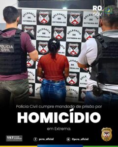 Nesta terça-feira (6), a Polícia Civil de Rondônia, por meio do Departamento de Inteligência e da 10ª Delegacia de Polícia de Porto Velho, no distrito de Extrema, deu cumprimento ao mandado de prisão em desfavor de M. T. C. M. K., investigada pela prática de crime de homicídio.
