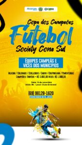 O desportista Natal Pimenta Jacob anunciou a realização do Torneio dos Campeões, que acontecerá neste domingo, 16, a partir das 8h30, no Clube Embratel, em Vilhena. O evento reunirá as equipes campeãs e vice-campeãs do Regional de Futebol 7, envolvendo municípios da região sul de Rondônia.