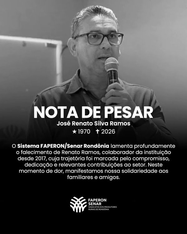“O Sistema Faperon/Senar Rondônia lamenta profundamente o falecimento de Renato Ramos, colaborador da instituição desde 2017, cuja trajetória foi marcada pelo compromisso, dedicação e relevantes contribuições ao setor. Neste momento de dor, manifestamos nossa solidariedade aos familiares e amigos”.