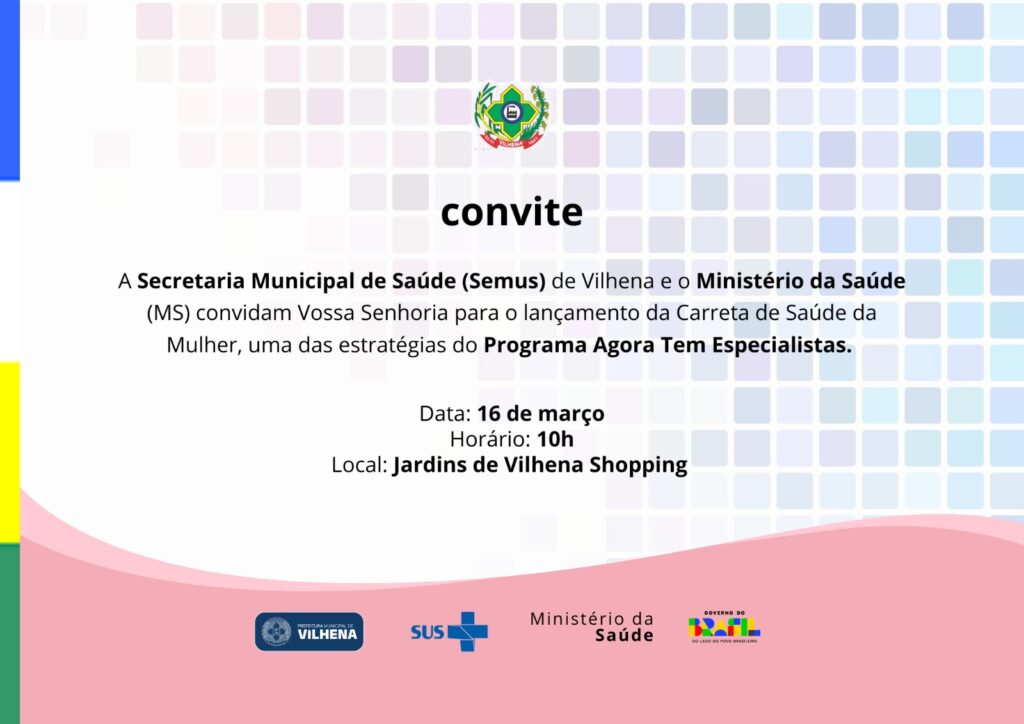 A Secretaria Municipal de Saúde de Vilhena (Semus), em parceria com o Ministério da Saúde, realiza nesta segunda-feira, 16, o lançamento oficial da Carreta de Saúde da Mulher, iniciativa que integra as ações do programa Agora Tem Especialistas, voltado à ampliação do acesso da população a atendimentos especializados. A cerimônia de lançamento está marcada para 10h, no Jardins de Vilhena Shopping.