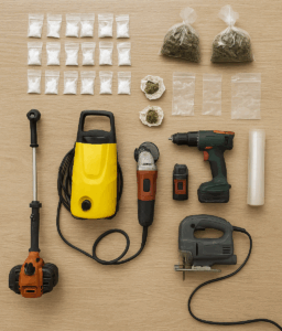 No mesmo local, a polícia apreendeu diversas ferramentas — entre elas uma roçadeira, lavadora de alta pressão, serra mármore, parafusadeira, nível a laser, furadeira, esmerilhadeira e rolos de fios elétricos — sem comprovação de origem lícita. Questionado, o suspeito negou ser dono das drogas e alegou que pertenciam a outro morador, sem revelar a identidade. A companheira também afirmou ter recebido os objetos de terceiros, sem apresentar notas fiscais, o que configurou indícios de receptação, tipificada no artigo 180 do Código Penal.