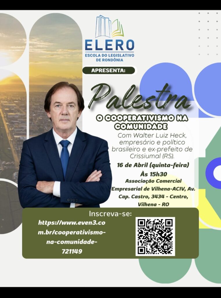 A Escola do Legislativo de Rondônia realiza, nesta quinta-feira (16), em Vilhena, a palestra “O Cooperativismo na Comunidade”, com o empresário e ex-prefeito de Crissiumal (RS), Walter Luiz Heck.