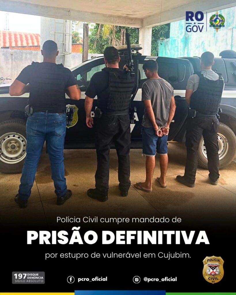 A Polícia Civil de Rondônia cumpriu, nesta sexta-feira (17), um mandado de prisão definitiva expedido pela 2ª Vara Criminal de Ariquemes contra um homem sentenciado pelo crime de estupro de vulnerável. A ordem judicial decorre de decisão já transitada em julgado.