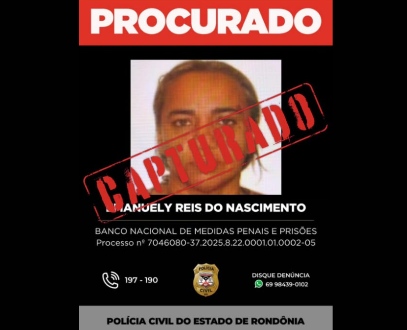 A Polícia Civil do Estado de Rondônia, por meio do Departamento de Homicídios e Proteção à Pessoa (DHPP), informa que, no dia 14 de março de 2026, foi capturada uma mulher investigada por envolvimento em crime de homicídio ocorrido na zona rural de Porto Velho.