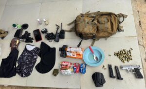 Durante as buscas, o indivíduo foi localizado próximo a um igarapé e, ao receber voz de parada, sacou uma pistola e efetuou disparos contra os policiais, configurando agressão injusta e iminente. A equipe reagiu de forma técnica e proporcional para cessar a ameaça. Após a intervenção, o suspeito foi contido, sendo apreendida uma pistola calibre .380, carregadores, dezenas de munições, rádios comunicadores, balaclavas, faca, dinheiro, documentos, além de mantimentos e anotações relacionadas à demarcação de terras e possível invasão de propriedade rural.