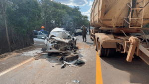 No local, os policiais se depararam com um cenário crítico, onde um veículo de passeio foi atingido violentamente na traseira por um caminhão e, em seguida, prensado contra outro veículo de carga, ficando completamente esmagado entre ambos.
