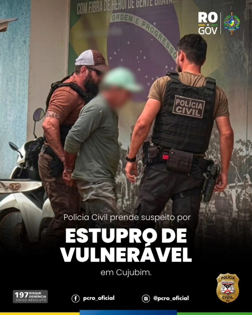 A Polícia Civil de Rondônia, por meio da 1ª Delegacia de Polícia Civil de Cujubim, cumpriu na data de hoje (23) mandado de prisão temporária relacionado ao crime de estupro de vulnerável. A medida foi expedida pela 2ª Vara Criminal da Comarca de Ariquemes.