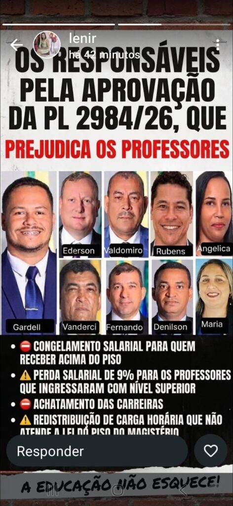 A mobilização ganhou força com a divulgação de uma imagem que vem sendo amplamente compartilhada na internet. O material reúne fotos de vereadores da cidade e associa a atuação dos parlamentares à aprovação da proposta, sob o lema “A educação não esquece!”, em um claro sinal de cobrança política.