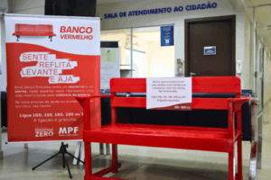 O Banco Vermelho instalado na sede do MPF em Porto Velho tem uma placa com uma reflexão: “Neste banco poderia ter uma mulher exercendo sua cidadania, mas foi vítima de feminicídio”. Há também os números telefônicos que podem ser acionados em caso de violência de gênero. Ao lado do Banco Vermelho, um banner convida: “Sente, reflita, levante e aja”.