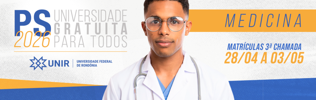 A Universidade Federal de Rondônia (UNIR) publicou edital de convocação para matrícula em 3ª chamada dos aprovados no Processo Seletivo UNIR 2026 para o curso de Medicina, com entrada no semestre 2026.1. As matrículas devem ser feitas no período de 28 de abril a 3 de maio, pelo sistema da UNIR.