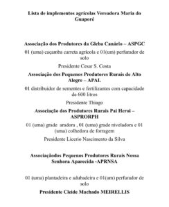 A vereadora Maria do Guaporé destinou um conjunto de implementos agrícolas para quatro associações rurais do município, com foco no fortalecimento da produção local e no apoio aos pequenos agricultores. Os equipamentos foram distribuídos conforme as demandas apresentadas por cada entidade, contribuindo para melhorias nas atividades desenvolvidas no campo.