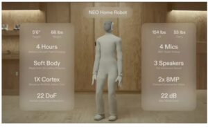 O Neo (que tem cerca de 1,60 metro e pesa em torno de 30 quilos) utiliza a tecnologia de IA chamada Redwood, um modelo de IA Generalista da 1X, para aprender e repetir tarefas, permitindo que o robô ganhe mais autonomia ao longo do tempo.