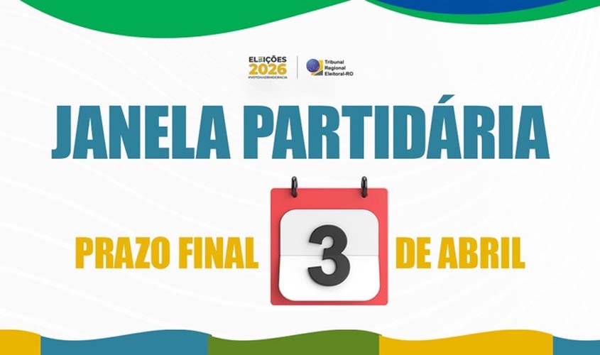Arte informativa sobre a janela partidária das Eleições 2026. No centro da imagem aparece um calendário destacando o número 3, indicando a data 3 de abril. Ao redor do calendário está o texto “Prazo final 3 de abril”. Na parte superior, em destaque, está o título “Janela Partidária”, acompanhado dos logotipos das Eleições 2026 e do Tribunal Regional Eleitoral de Rondônia (TRE-RO). A arte utiliza cores institucionais, como azul, verde e amarelo, com elementos gráficos ondulados no topo e na base.